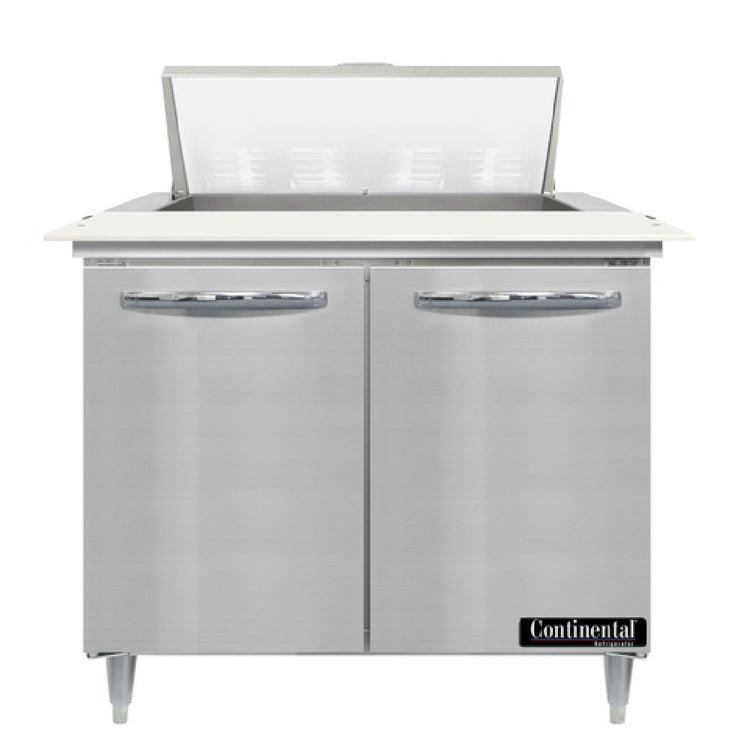 The Continental Refrigerator D36N8C Designer Line Sandwich Unit 36"W Two-section is a precision-engineered piece designed to cater to the exacting demands of the foodservice industry. Measuring 36 inches in width, this unit features two sections with an impressive capacity for eight 1/6 size pans, each 4 inches deep, making it perfect for sandwich preparation. It is equipped with a generous 19-inch cutting board, facilitating seamless food prep operations. The unit's practical design includes two field rehingeable doors, enhancing accessibility and flexibility in various kitchen layouts. Constructed with a stainless steel top, front, sides, and interior, this sandwich unit promises durability and ease of cleaning. Its electronic control with a digital display offers precise temperature adjustments, while the hi-low alarm ensures food safety by alerting users to temperature fluctuations. The unit stands on 6-inch adjustable legs, providing stability on uneven surfaces. Its rear-mounted, self-contained refrigeration system incorporates an automatic hot gas condensate evaporator and utilizes environmentally friendly R290 hydrocarbon refrigerant. Powered by a 1/5 hp motor, the Continental Refrigerator D36N8C is cETLus and NSF certified, assuring compliance with safety and sanitation standards, making it an invaluable asset for any professional kitchen setup.