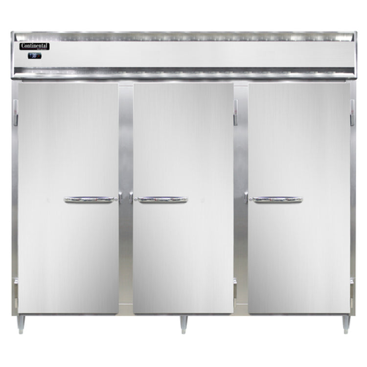 The Continental Refrigerator D3REN Designer Line Wide Refrigerator Reach-in 85-1/5"W is a versatile refrigeration solution tailored for commercial kitchens and foodservice industries. This reach-in refrigerator is engineered with a robust three-section, self-contained design that ensures optimal cooling efficiency. The unit boasts an aluminum exterior and interior complemented by a stainless steel front, providing durability and ease of maintenance. With a standard depth cabinet and wide full-height stainless steel doors, it offers significant storage capacity. Each door is equipped with a cylinder lock for enhanced security, and the electronic control with digital display provides precise temperature management. The hi-low alarm feature ensures food safety by alerting users to temperature deviations. Supported by 6" stainless steel legs, the refrigerator is stable and easy to clean beneath. Utilizing R290 Hydrocarbon refrigerant, it is energy-efficient and environmentally friendly. Powered by a 1/2 HP compressor, this refrigerator is cETLus and NSF certified, meeting stringent safety and sanitation standards. Ideal for diverse market segments, from restaurants to catering services, the Continental Refrigerator D3REN combines innovative design with reliable performance, making it an invaluable asset for any professional kitchen setting.