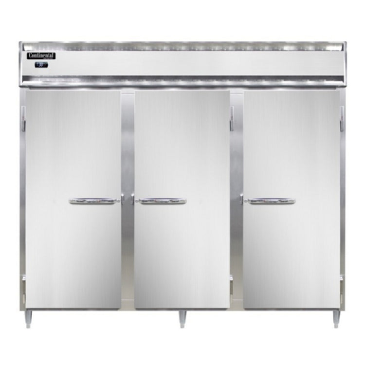 Continental Refrigerator, D3RENPT-SD-GD, Designer Line Wide Refrigerator, 75 cu. ft. capacity, pass-thru, 85-1/5" wide three-section, self-contained refrigeration, standard depth cabinet, electronic controller with digital display, wide full-height stainless steel doors on front, wide full-height glass doors on rear, aluminum exterior & interior, stainless steel front, 6" stainless steel legs, NEMA-5-15P, 1/2 HP, cETLus, NSF, Made in the USA