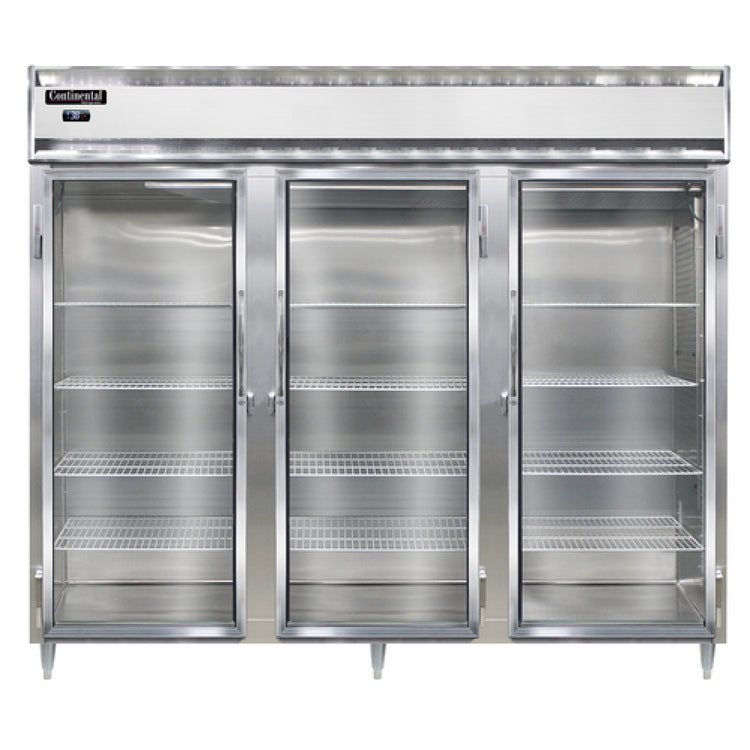 The Continental Refrigerator D3RENSAGD Designer Line Wide Refrigerator Reach-in 85-1/5"W is a premium refrigeration solution designed for diverse professional environments. Featuring a three-section, self-contained refrigeration system, this model combines functionality with sleek design. Its stainless steel exterior provides durability, while the aluminum interior ensures efficient cooling. The refrigerator boasts wide full-height glass doors, allowing for clear visibility and easy access to contents. Secure storage is guaranteed through the inclusion of cylinder locks. The electronic control system with a digital display offers precise temperature management, complemented by a hi-low alarm for added safety. Standing on 6" stainless steel legs, the unit is both sturdy and easy to clean. Utilizing the eco-friendly R290 Hydrocarbon refrigerant, it operates with a 1/2 HP compressor. Certified by cETLus and NSF, this refrigerator meets rigorous safety and sanitation standards. With its standard depth cabinet, the D3RENSAGD is a versatile choice for food service operations seeking reliable refrigeration with a contemporary design.