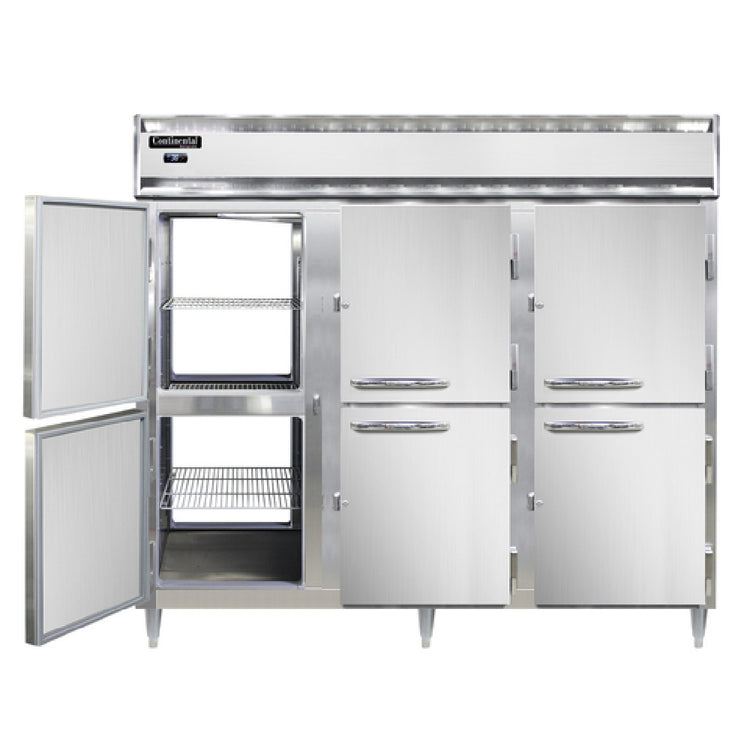 The Continental Refrigerator D3RENSAPTHD Designer Line Wide Refrigerator Pass-thru is a versatile solution for commercial kitchens requiring efficient and reliable refrigeration. With an 85-1/5" width, this three-section refrigerator provides ample space for a variety of storage needs. Its self-contained refrigeration system ensures consistent cooling with the environmentally friendly R290 Hydrocarbon refrigerant, powered by a robust 1/2 HP motor. The stainless steel exterior and aluminum interior offer durability and easy maintenance, making it a practical choice for busy kitchens. The standard depth cabinet is complemented by wide half-height stainless steel doors, each equipped with cylinder locks for added security. An electronic control with a digital display and hi-low alarm ensures precise temperature management. The refrigerator stands on 6" stainless steel legs, providing stability and ease of cleaning underneath. Certified by cETLus and NSF, the Continental Refrigerator D3RENSAPTHD meets stringent safety and sanitation standards. This pass-thru model allows for convenient access from both sides, making it ideal for high-traffic food service environments. Whether used in a hospitality setting, a catering operation, or a busy restaurant kitchen, this refrigerator delivers exceptional performance with a focus on quality and reliability.
