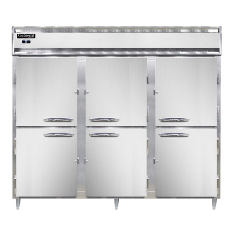 Continental Refrigerator, D3RENSAPTHD-SD-GD, Designer Line Wide Refrigerator, 75 cu. ft. capacity, pass-thru, 85-1/5" wide three-section, self-contained refrigeration, standard depth cabinet, electronic controller with digital display, wide half-height stainless steel doors on front, wide half-height glass doors on rear, stainless steel exterior, aluminum interior, 6" stainless steel legs, NEMA-5-15P, 1/2 HP, cETLus, NSF, Made in the USA