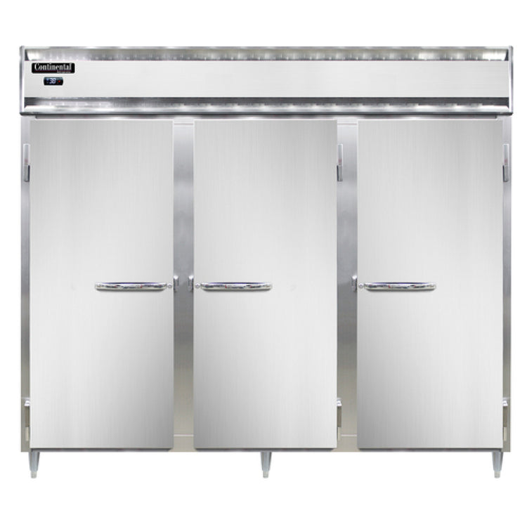 The Continental Refrigerator D3RENSS Designer Line Wide Refrigerator Reach-in 85-1/5"W is a high-capacity, three-section refrigeration solution crafted for diverse commercial environments. With dimensions of 85-1/5 inches wide, it accommodates extensive storage needs, making it suitable for large-scale operations. The refrigerator features a robust stainless steel exterior and interior, ensuring durability and ease of maintenance. It comes equipped with self-contained refrigeration using R290 Hydrocarbon refrigerant, which is eco-friendly and efficient. The unit includes wide full-height stainless steel doors complete with cylinder locks for security, and an electronic control system with a digital display and a hi-low alarm for precise temperature management. Supported on sturdy 6-inch stainless steel legs, this refrigerator promises stability and ease of cleaning underneath. With a 1/2 HP compressor, it delivers reliable cooling performance. Certified by cETLus and NSF, the D3RENSS meets rigorous safety and sanitation standards, making it a trusted choice for the foodservice industry. Its standard depth cabinet is designed to maximize storage without compromising on space efficiency, catering to restaurants, hotels, and institutional kitchens seeking a blend of functionality and aesthetic appeal.
