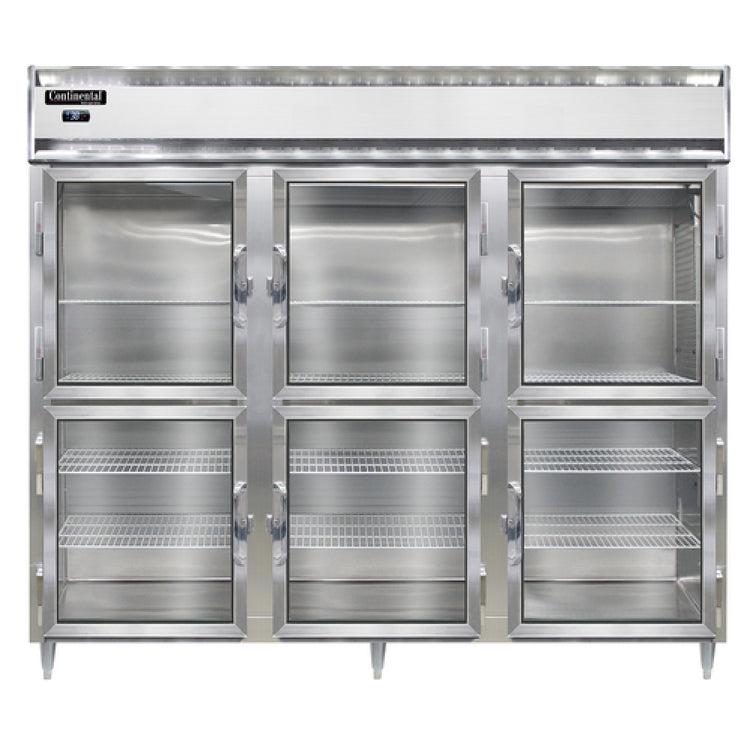 The Continental Refrigerator D3RENSSGDHD Designer Line Wide Refrigerator Reach-in is a high-performance unit meticulously crafted for commercial applications demanding exceptional refrigeration solutions. Measuring 85-1/5 inches wide, this three-section refrigerator is designed with a self-contained refrigeration system, ensuring efficient cooling across its expansive storage area. The exterior and interior are constructed from premium stainless steel, providing robustness and a sleek appearance. Its standard depth cabinet is equipped with wide half-height glass doors, each featuring cylinder locks for enhanced security. The advanced electronic control system comes with a digital display and a hi-low alarm, offering precise temperature management. Standing on 6-inch stainless steel legs, this unit ensures stability while facilitating easy cleaning underneath. Notably, it utilizes R290 Hydrocarbon refrigerant, a more environmentally friendly option that contributes to energy efficiency. Powered by a 1/2 HP motor, the refrigerator is both cETLus and NSF certified, confirming its compliance with industry standards for safety and sanitation. The combination of these features makes the Continental D3RENSSGDHD a preferred choice in various market segments, including restaurants, hotels, and catering businesses, where maintaining high standards of food preservation is crucial.