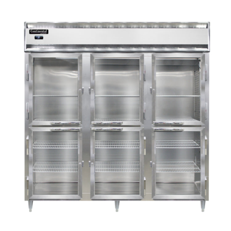 Continental Refrigerator, D3RNSAPTHD-GD-SD, Designer Line Refrigerator, 72 cubic ft. capacity, pass-thru, three-section, self-contained refrigeration, stainless steel exterior, aluminum interior, standard depth cabinet, half-height glass doors on front, half-height stainless steel doors on rear, 6" stainless steel legs, electronic controller w/ digital display, NEMA-5-15P, 1/2 HP, cETLus, NSF, Made in the USA