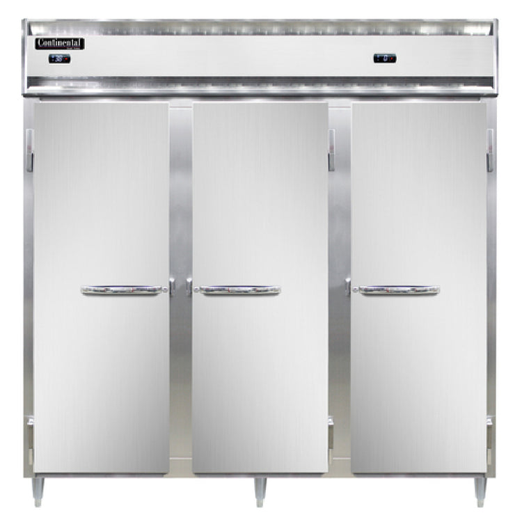 The Continental Refrigerator D3RRFNSA Designer Line Refrigerator/Freezer Reach-in is a three-section unit tailored for efficient food storage in commercial settings. This model boasts a self-contained refrigeration system, ensuring consistent performance across its sections. The exterior is crafted from durable stainless steel, while the interior utilizes high-quality aluminum, optimizing the balance between durability and weight. The unit's standard depth cabinet is designed to accommodate various storage needs, and its narrow full-height solid doors are equipped with cylinder locks for enhanced security. An electronic control with a digital display offers intuitive management, accompanied by a hi-low alarm system to maintain food safety standards. Utilizing R290 hydrocarbon refrigerant, this refrigerator/freezer supports environmentally friendly operations. The dual compressors - 1/3 HP and 1/2 HP - provide robust and reliable cooling, catering to diverse market segments within the foodservice industry. Certified by cETLus and NSF, it meets rigorous standards for safety and sanitation. Whether utilized in a bustling restaurant or a high-demand catering service, the Continental Refrigerator D3RRFNSA stands out as a versatile and dependable solution, integrating advanced features designed to optimize and streamline food storage processes in various professional environments.