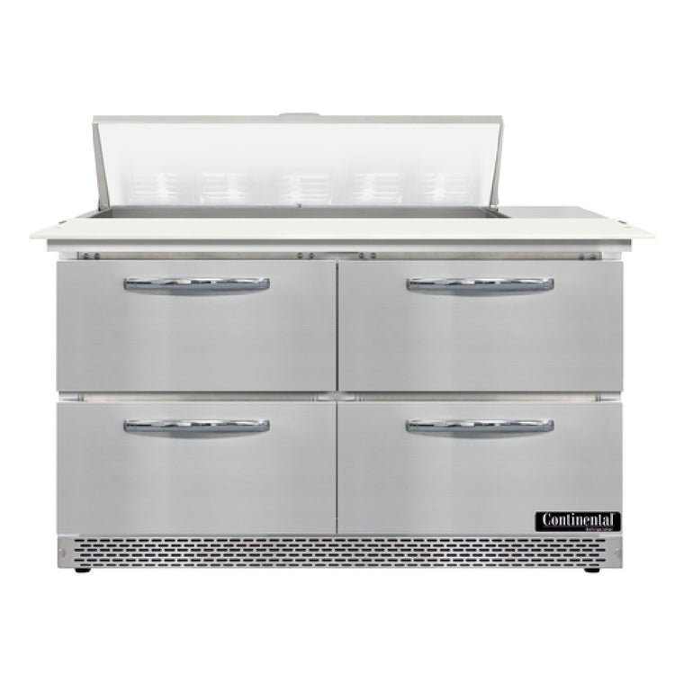 The Continental Refrigerator D48N10C-FB-D Designer Line Sandwich Unit Front Breather is a highly efficient refrigeration solution tailored for commercial kitchens seeking advanced food storage capabilities. This 48-inch wide, two-section unit is equipped with ten 1/6 size pans, each 4 inches deep, and features a 19-inch cutting board, making it ideal for preparing and storing a variety of ingredients. The unit includes four drawers, each capable of accommodating one 12 x 18 x 6 pan or a combination of one 1/2 x 6 pan and one 1/3 x 6 pans, facilitating versatile storage options. Its stainless steel top, front, sides, and interior ensure durability and ease of cleaning. The electronic control with a digital display and hi-low alarm provides precise temperature management. With 3-3/4-inch casters, it offers mobility and easy positioning in busy kitchen environments. The rear-mounted, self-contained refrigeration system employs an automatic hot gas condensate evaporator and utilizes R290 hydrocarbon refrigerant, supported by a 1/4 horsepower compressor. Certified with cETLus and NSF, this unit is designed to meet rigorous safety and quality standards. The Continental Refrigerator D48N10C-FB-D is an ideal choice for foodservice establishments looking for reliable, efficient, and versatile refrigeration solutions.
