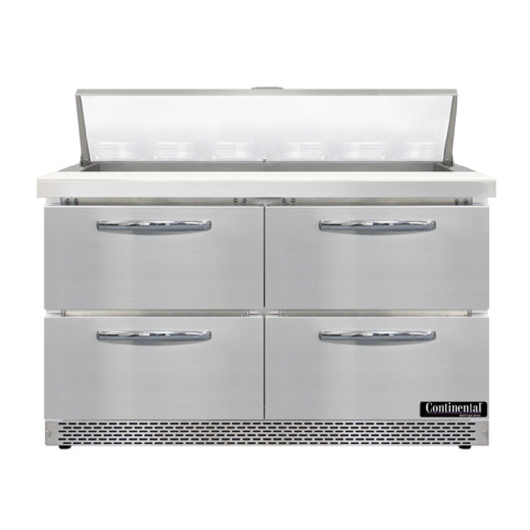 The Continental Refrigerator D48N12-FB-D Designer Line Sandwich Unit Front Breather is a highly specialized refrigeration solution designed to meet the diverse needs of commercial kitchens. This 48-inch wide, two-section unit is equipped with twelve 1/6 size x 4-inch deep pans, accompanied by a 12-inch cutting board, making it a versatile choice for sandwich preparation. It features four drawers, each accommodating either one 12 x 18 x 6 pan or a combination of one 1/2 x 6 pan and one 1/3 x 6 pans, although the pans are supplied separately. Constructed with a stainless-steel top, front, sides, and interior, the unit ensures durability and easy maintenance. The electronic control with digital display and a hi-low alarm provides precise temperature management. Mounted on 3-3/4-inch casters, it offers mobility within a busy kitchen environment. The rear-mounted self-contained refrigeration system utilizes R290 hydrocarbon refrigerant, supported by an automatic hot gas condensate evaporator, and operates with a 1/4 hp compressor. This refrigeration unit is cETLus and NSF certified, guaranteeing its adherence to safety and sanitation standards. The Continental Refrigerator D48N12-FB-D is an exceptional choice for food service operations that demand efficiency, reliability, and superior cold storage solutions in a compact design.