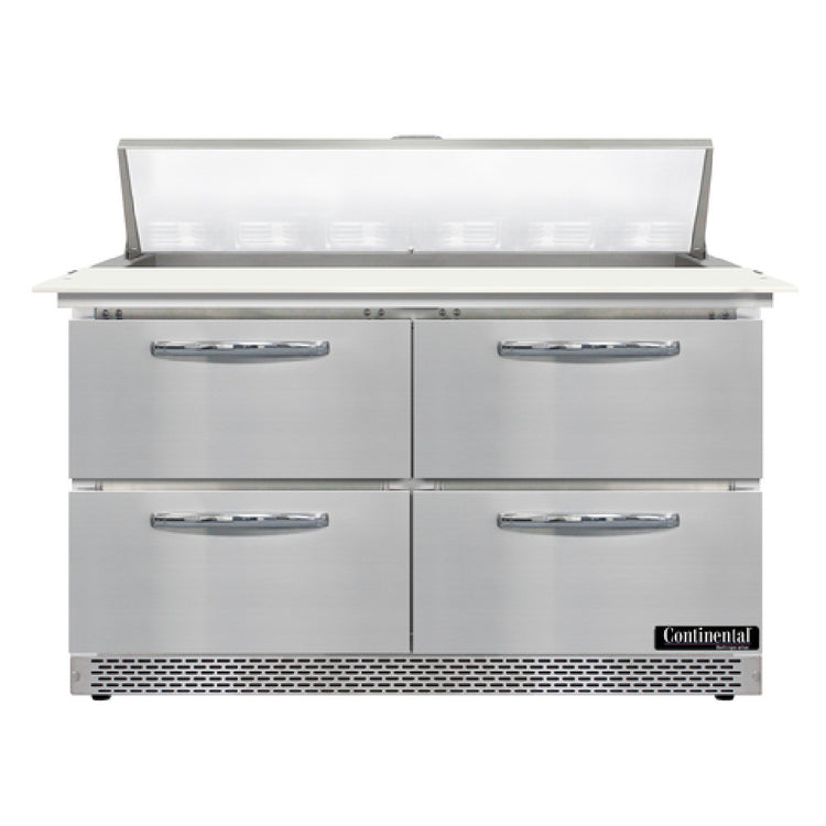 The Continental Refrigerator D48N12C-FB-D Designer Line Sandwich Unit Front Breather is a 48-inch wide, two-section refrigeration unit designed for efficient food preparation and storage in commercial kitchens. It accommodates twelve 1/6 size pans, each 4 inches deep, and features a 19-inch cutting board, enhancing its utility for sandwich preparation. The unit is equipped with four drawers, each capable of holding one 12 x 18 x 6 pan or a combination of one 1/2 x 6 pan and one 1/3 x 6 pan, providing flexible storage solutions (pans supplied separately). Constructed with a stainless steel top, front, sides, and interior, it ensures durability and easy maintenance. The electronic control with digital display and hi-low alarm offers precise temperature management. Mobility is facilitated by 3-3/4 inch casters, and the rear-mounted, self-contained refrigeration system with an automatic hot gas condensate evaporator uses R290 hydrocarbon refrigerant. Its 1/4 horsepower motor underscores its efficient operation. The unit is cETLus and NSF certified, attesting to its compliance with safety and sanitation standards. This sandwich unit is ideal for delis, cafes, and restaurants, providing versatile, reliable refrigeration with a sleek design suitable for front-of-house applications.