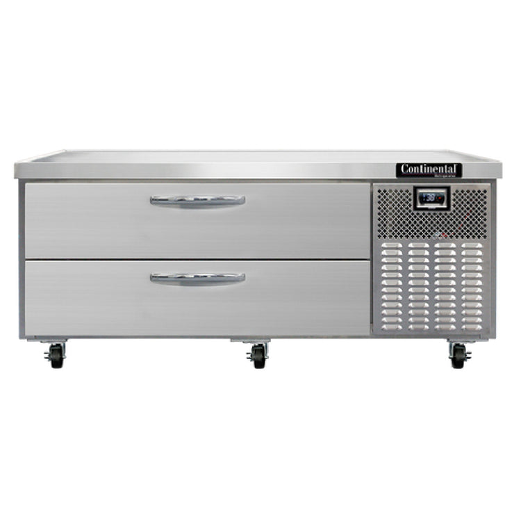 The Continental Refrigerator D60GN Refrigerator Griddle Stand is a versatile refrigeration solution designed to meet the diverse needs of the food service industry. This one-section unit features two convenient drawers that can accommodate up to three pans measuring 12" x 20" x 6" each, making it an excellent choice for maximizing storage efficiency in busy kitchens. Constructed with a durable stainless steel top equipped with a drip guard marine edge, along with a stainless steel exterior and interior, this griddle stand ensures longevity and easy maintenance. The unit operates using a self-contained refrigeration system powered by a 1/4 HP motor and utilizes environmentally friendly R290 hydrocarbon refrigerant. For user convenience, the stand comes with electronic controls featuring a digital display and a hi-low alarm for precise temperature management. A 10-foot cord provides ample flexibility for placement within various kitchen layouts. Certified by cETLus and NSF, and holding an ENERGY STAR® rating, the Continental Refrigerator D60GN combines reliability with efficiency, making it a significant asset for restaurant and catering operations seeking consistent cooling performance and energy savings. Its thoughtful design and robust capabilities cater to the demanding environments of professional kitchens.