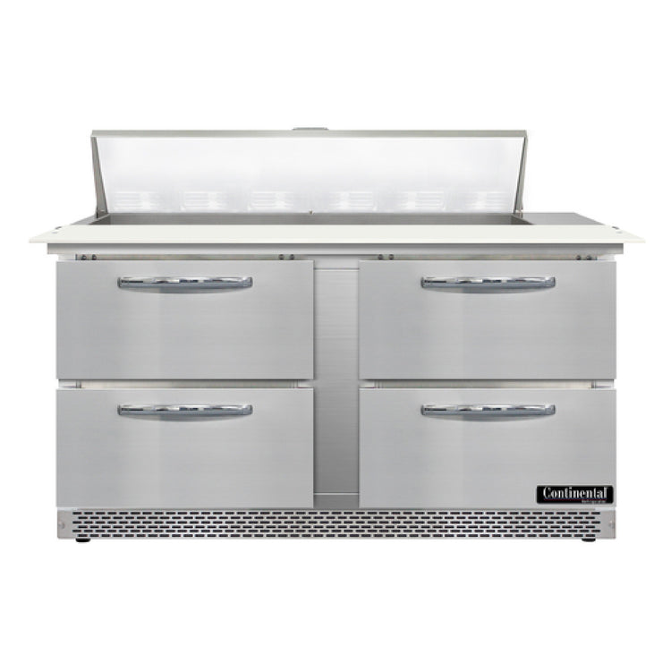 The Continental Refrigerator D60N12C-FB-D Designer Line Sandwich Unit Front Breather is a premium two-section refrigeration unit measuring 60 inches in width. It is expertly crafted with a stainless steel top, front, sides, and interior, ensuring durability and ease of maintenance. This unit features 12 one-sixth size pans, each 4 inches deep, accompanied by a spacious 19-inch cutting board, catering to the needs of busy commercial kitchens. The four drawers are designed to accommodate one 12 x 20 x 6 pan each, although these pans are supplied separately. With advanced electronic control and a digital display, this unit allows for precise temperature management, supported by a hi-low alarm for added security. The rear-mounted self-contained refrigeration utilizes R290 hydrocarbon refrigerant, powered by a 1/3 HP motor, providing efficient cooling while being environmentally friendly. Automatic hot gas condensate evaporation enhances its functionality, and the front breather design maximizes space utilization. For mobility, the unit is fitted with 3-3/4 inch casters. Certified by cETLus and NSF standards, this sandwich unit is a versatile and reliable choice for various food service environments, combining superior design with practical features to optimize food preparation and storage.