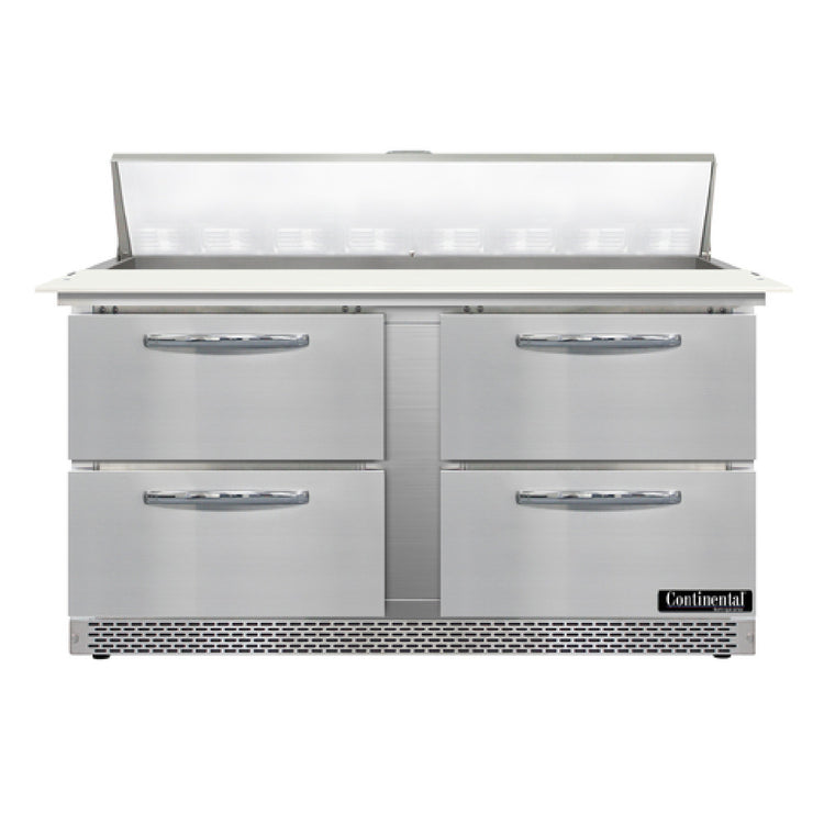 The Continental Refrigerator D60N16C-FB-D Designer Line Sandwich Unit - Front Breather is a high-performance refrigeration solution designed for efficiency and durability in commercial kitchen environments. Measuring 60 inches wide, this two-section unit features a front breather design that enhances its versatility in various kitchen layouts. It includes 16 pans each sized at 1/6 and 4 inches deep, complemented by a spacious 19-inch cutting board. The unit is equipped with four drawers, each capable of accommodating one 12 x 20 x 6 pan, providing ample storage for a range of ingredients. Constructed with a stainless steel top, front, sides, and interior, it promises exceptional durability and ease of cleaning. The electronic control with digital display and hi-low alarm ensures precise temperature management, while the 3-3/4 inch casters offer mobility for easy repositioning. Featuring a rear-mounted self-contained refrigeration system and an automatic hot gas condensate evaporator, the unit operates with R290 hydrocarbon refrigerant and is powered by a 1/3 HP compressor. Certified by cETLus and NSF, this sandwich unit is a reliable choice for foodservice professionals seeking efficient refrigeration with advanced design elements.