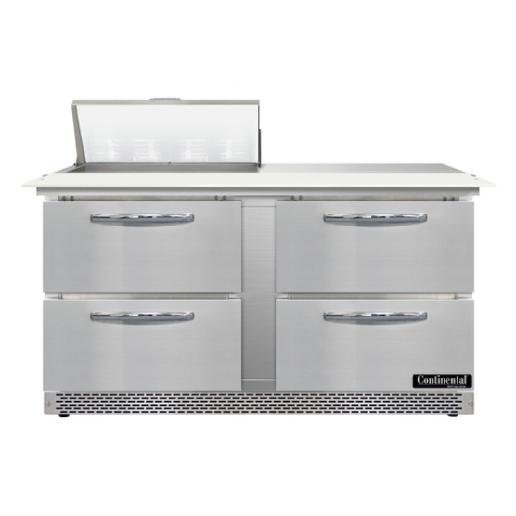 The Continental Refrigerator D60N8C-FB-D Designer Line Sandwich Unit Front Breather is a versatile refrigeration solution tailored for high-demand commercial kitchen environments. This two-section unit measures 60 inches wide and is equipped with eight 1/6 size pans, each 4 inches deep, making it perfect for preparing and storing sandwich ingredients. A spacious 19-inch cutting board enhances its functionality, catering to efficient food preparation. The unit boasts four drawers, each capable of accommodating one 12 x 20 x 6 pan, allowing for flexible storage options. Constructed with a stainless steel top, front, sides, and interior, this sandwich unit ensures durability and ease of cleaning. The electronic control with digital display provides precise temperature management, supported by a high-low alarm system for added reliability. Mounted on 3-3/4 inch casters, the unit offers mobility, while the rear-mounted, self-contained refrigeration system incorporates an automatic hot gas condensate evaporator, utilizing R290 hydrocarbon refrigerant. With a 1/3 HP motor, this unit is cETLus and NSF certified, underscoring its compliance with stringent safety and quality standards. Designed for efficiency and practicality, the Continental Refrigerator D60N8C-FB-D stands out as an essential asset in food service operations.
