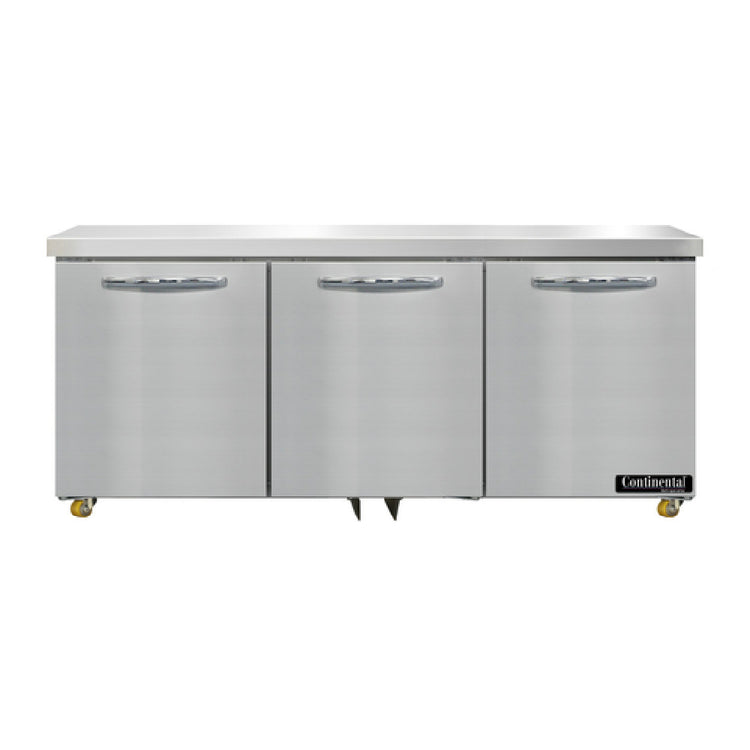 The Continental Refrigerator D72N-U Designer Line Undercounter Refrigerator 72"W Three-section stands out with its three-section design, providing versatile storage solutions tailored for a range of commercial kitchen environments. Each section features a field rehingeable door, enhancing its adaptability in various layouts. The robust stainless steel exterior and interior ensure durability and longevity, while the stainless steel top provides a seamless workspace. Mobility and ease of positioning are facilitated by 1-3/8" diameter plate casters. This refrigerator operates with a front-breathing design, ideal for spaces with limited ventilation options. Advanced electronic control with digital display offers precise temperature regulation, complemented by a hi-low alarm for enhanced monitoring. The rear-mounted self-contained refrigeration system employs R290 hydrocarbon refrigerant, noted for its eco-friendly properties and energy efficiency. With a 1/5 HP motor, the refrigerator efficiently maintains optimal cooling. Certified by cETLus and NSF, it meets rigorous safety and sanitation standards. Additionally, its ENERGY STAR® rating underscores its commitment to energy conservation. This refrigeration solution is meticulously engineered to meet the demands of food service establishments, providing exceptional reliability and performance across diverse market segments within the industry.