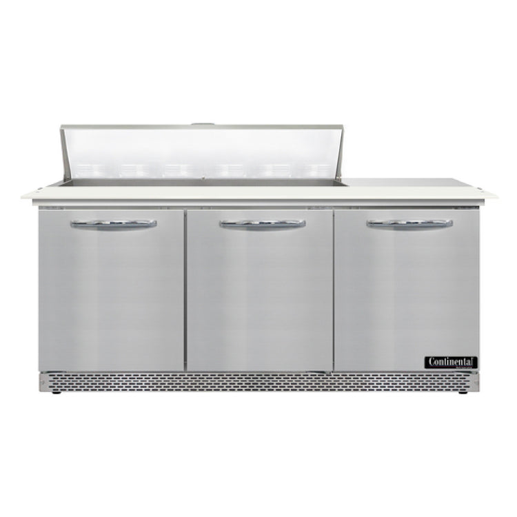 The Continental Refrigerator D72N12C-FB Designer Line Sandwich Unit Front Breather is a highly specialized piece of refrigeration equipment, tailored for commercial kitchen environments that demand efficiency and reliability. With a width of 72 inches, this three-section unit is equipped with twelve 1/6 size pans, each 4 inches deep, and a 19-inch cutting board, providing ample preparation space and ingredient organization. Its design features three field rehingeable doors, allowing for flexible door placement to suit kitchen layouts. Constructed with a stainless steel top, front, sides, and interior, this unit emphasizes durability and ease of cleaning. The electronic control with digital display ensures precise temperature regulation, complemented by a hi-low alarm for added security. The front-breathing design optimizes airflow, essential for placement in confined spaces. For mobility and stability, the unit stands on 3-3/4 inch casters. The rear-mounted self-contained refrigeration utilizes an automatic hot gas condensate evaporator and R290 hydrocarbon refrigerant, demonstrating a commitment to energy efficiency and environmental responsibility. Powered by a 1/3 HP compressor, it is both cETLus and NSF certified, underscoring its compliance with industry standards. This unit is a versatile solution for delis, sandwich shops, and food service operations seeking reliable cold storage and prep station integration.
