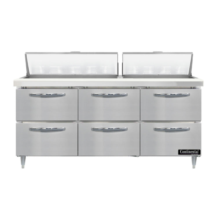 The Continental Refrigerator D72N18-D Designer Line Sandwich Unit is a 72"W, three-section unit designed for efficiency and functionality in commercial kitchens. This unit is equipped with eighteen 1/6 size x 4" deep pans, paired with a generous 12" cutting board for streamlined food preparation. The six drawers are versatile, each accommodating either one 12 x 18 x 6 pan or a combination of one 1/2 x 6 pan and one 1/3 x 6 pans, offering ample storage options. Constructed with stainless steel on the top, front, sides, and interior, it promises durability and easy maintenance. The unit's electronic control with digital display and hi-low alarm ensures precise temperature management. It stands on 6" adjustable legs for stability and convenience. The rear-mounted self-contained refrigeration system, enhanced by an automatic hot gas condensate evaporator, utilizes R290 hydrocarbon refrigerant, which is environmentally friendly and efficient. Powered by a 1/3 HP motor, this sandwich unit meets cETLus and NSF standards, making it a reliable choice for diverse food service operations that demand quality refrigeration solutions.