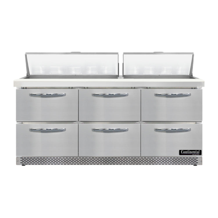 The Continental Refrigerator D72N18-FB-D Designer Line Sandwich Unit Front Breather is a high-quality, 72-inch wide unit designed for efficient food preparation and storage in commercial kitchens. This three-section unit features a stainless steel top, front, sides, and interior, ensuring durability and easy maintenance. It holds eighteen 1/6 size pans, each 4 inches deep, and includes a 12-inch cutting board for convenient food prep. The unit is equipped with six drawers, each accommodating either one 12 x 18 x 6 pan, or a combination of one 1/2 x 6 pan and one 1/3 x 6 pan. The refrigeration system, rear-mounted and self-contained, uses R290 hydrocarbon refrigerant, powered by a 1/3 HP compressor, and features an automatic hot gas condensate evaporator, ensuring efficient operation. The electronic control includes a digital display and a hi-low alarm for easy monitoring. With 3-3/4 inch casters, the unit is easily movable. The Continental Refrigerator D72N18-FB-D is cETLus and NSF certified, making it a reliable choice for restaurants, cafes, and other food service establishments seeking functionality and regulatory compliance in their kitchen equipment.