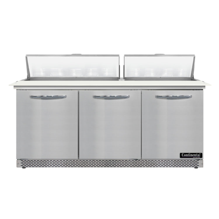 The Continental Refrigerator D72N18C-FB Designer Line Sandwich Unit Front Breather is a meticulously engineered refrigeration solution, ideal for commercial kitchens demanding efficiency and reliability. This three-section unit, measuring 72 inches wide, offers ample storage with its array of eighteen 1/6 size pans, each 4 inches deep. Equipped with a 19-inch cutting board, it facilitates seamless food preparation processes. Its three field-rehingeable doors enhance the versatility and accessibility of the unit, catering to varying kitchen layouts. Constructed with a stainless steel top, front, sides, and interior, the D72N18C-FB ensures durability and easy maintenance. The unit's advanced electronic control system, featuring a digital display and hi-low alarm, provides precise temperature monitoring for optimal food preservation. Mounted on 3-3/4 inch casters, this sandwich unit offers mobility and convenience in busy kitchen environments. Its rear-mounted self-contained refrigeration system uses R290 hydrocarbon refrigerant and includes an automatic hot gas condensate evaporator for efficient operation. With a robust 1/3 HP compressor, this unit is both cETLus and NSF certified, guaranteeing adherence to stringent safety and quality standards. The Continental Refrigerator D72N18C-FB is an exemplary choice for industries seeking a high-performance, reliable, and versatile refrigeration solution.