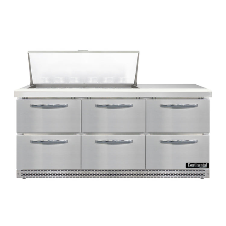 The Continental Refrigerator D72N18M-FB-D Designer Line Mighty Top Sandwich Unit Front Breather is a high-performance refrigeration solution designed for commercial kitchens and food service operations. This 72-inch wide, three-section unit features a top-mounted refrigeration system with front breathing capabilities, making it an ideal choice for environments with limited space. It accommodates eighteen 1/6 size pans that are 4 inches deep and includes a convenient 8-inch cutting board. The unit is equipped with six drawers, each capable of holding one 12 x 18 x 6 pan or a combination of one 1/2 x 6 pan and one 1/3 x 6 pan, providing versatile storage options. Constructed with a stainless steel top, front, sides, and interior, this unit ensures durability and easy cleaning. The electronic control with digital display and hi-low alarm offers precise temperature management. Featuring rear-mounted, self-contained refrigeration with an automatic hot gas condensate evaporator and R290 hydrocarbon refrigerant, it is efficient and environmentally friendly. The unit operates with a 1/3 HP compressor and is supported by 3-3/4 inch casters for mobility. Certified by cETLus and NSF, the Continental Refrigerator D72N18M-FB-D combines advanced refrigeration technology with a robust design, meeting the demands of busy kitchens and ensuring compliance with safety standards.