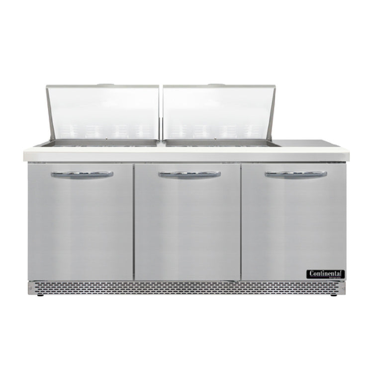 The Continental Refrigerator D72N24M-FB Designer Line Mighty Top Sandwich Unit Front Breather is a versatile and efficient solution for commercial kitchens, designed to enhance food preparation and storage. With a width of 72 inches, this three-section sandwich unit accommodates 24 pans, each 1/6 size and 4 inches deep, offering substantial storage capacity for various ingredients. The unit features an 8-inch cutting board for convenient food preparation. Its construction includes a stainless steel top, front, sides, and interior, ensuring durability and easy cleaning. Equipped with three field rehingeable doors, it provides flexible access options. The electronic control with digital display and hi-low alarm enhances operational efficiency, while the rear mounted self-contained refrigeration system uses R290 hydrocarbon refrigerant with a 1/3 HP compressor, ensuring energy efficiency and eco-friendliness. The automatic hot gas condensate evaporator further improves maintenance by reducing manual intervention. Mobility is simplified with 3-3/4 inch casters, allowing easy relocation within the workspace. The unit's front breathing design optimizes its placement in tight spaces, addressing diverse kitchen layouts. Certified by cETLus and NSF, the D72N24M-FB meets rigorous safety and performance standards, making it an exceptional asset for food service operations prioritizing efficiency and reliability.