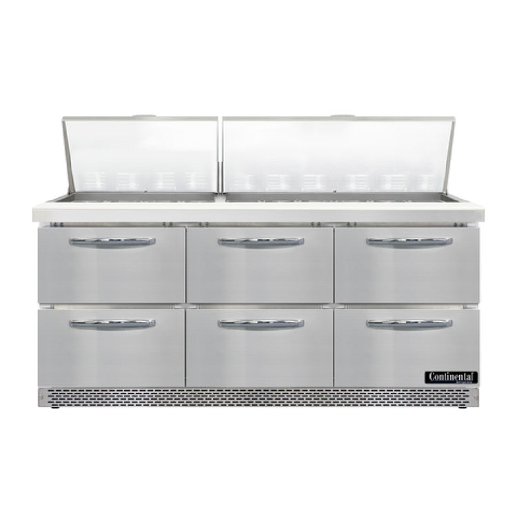 The Continental Refrigerator D72N30M-FB-D Designer Line Mighty Top Sandwich Unit Front Breather is a highly specialized refrigeration solution designed for commercial food settings. With a 72-inch width, this three-section unit offers significant storage versatility, accommodating thirty 1/6 size pans at a 4-inch depth. The inclusion of an 8-inch cutting board enhances its functionality, providing a convenient preparation surface. Each of its six drawers has the capacity to hold either a single 12 x 18 x 6 pan or a combination of one 1/2 x 6 pan and one 1/3 x 6 pan, offering flexibility for various storage needs (pans supplied by others). Constructed with a stainless steel top, front, sides, and interior, the unit is built for durability and ease of cleaning. Equipped with electronic controls and a digital display, it also features a hi-low alarm for added operational security. The unit's mobility is facilitated by 3-3/4 inch casters, while rear-mounted self-contained refrigeration and an automatic hot gas condensate evaporator ensure efficient performance. Utilizing R290 hydrocarbon refrigerant and powered by a 1/3 HP motor, this unit meets cETLus and NSF standards, making it a reliable choice for maintaining food safety and quality in demanding professional kitchens.