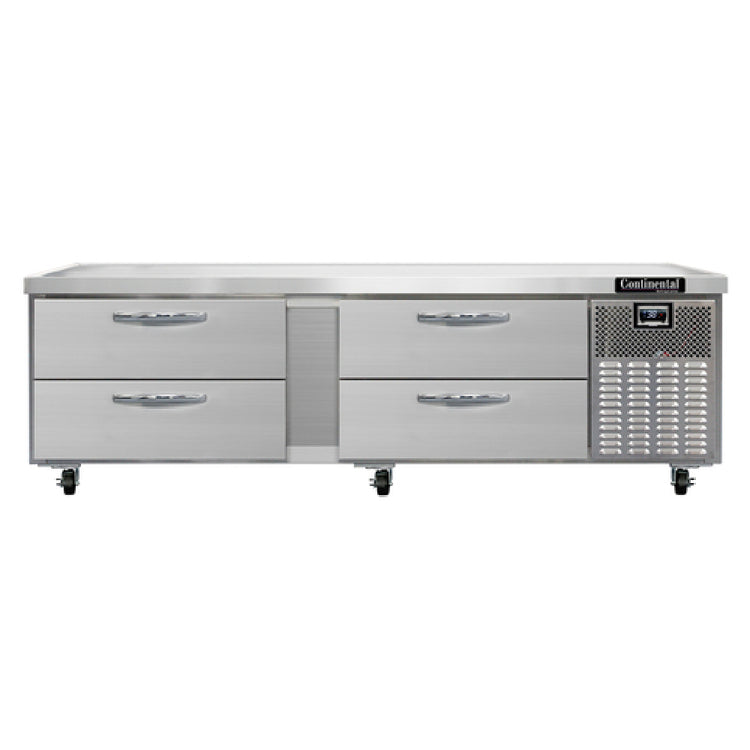 The Continental Refrigerator D84GN Refrigerator Griddle Stand Two-section is a meticulously engineered refrigeration solution tailored for the dynamic needs of the food service industry. This sophisticated unit features a two-section design with four drawers, each accommodating up to two pans measuring 12" x 20" x 6", making it exceptionally versatile for kitchen operations requiring precise organization. The stainless steel top with a drip guard marine edge offers durability and easy maintenance, while the stainless steel exterior and interior enhance both resilience and aesthetic appeal. Equipped with electronic control and a digital display, the D84GN ensures precise temperature regulation, accompanied by a hi-low alarm for added safety. The self-contained refrigeration system, utilizing R290 hydrocarbon refrigerant, operates with a 1/4 HP compressor and includes a 10-foot cord for convenient installation. This model is cETLus certified, NSF-approved, and bears the ENERGY STARĀ® mark, validating its compliance with stringent energy efficiency and safety standards. The Continental Refrigerator D84GN is an ideal asset for commercial kitchens, offering reliable performance and efficient storage solutions for professionals in the culinary sector.