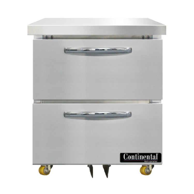 The Continental Refrigerator DF27N-U-D Designer Line Undercounter Freezer 27"W one-section is an impeccably designed unit tailored for versatile commercial use. Its compact 27-inch width and single-section configuration include two durable drawers, each capable of accommodating one 12 x 20 x 6 pan, offering ample storage flexibility for a variety of applications. The freezer boasts a sleek stainless steel exterior and interior, ensuring both durability and a professional aesthetic. With a stainless steel top and 1-3/8" diameter plate casters, it offers ease of mobility and placement, making it an adaptable choice for tight spaces. Engineered with a front-breathing system, the freezer optimizes space utilization and airflow management. The electronic control with digital display, enhanced by a hi-low alarm, provides precise temperature monitoring and management. Its rear-mounted, self-contained refrigeration system employs R290 hydrocarbon refrigerant, making it an eco-friendly choice while maintaining a powerful 1/4 HP performance. Certified by cETLus and NSF, this undercounter freezer meets rigorous safety and sanitation standards, making it a reliable asset for restaurants, cafes, and other food service establishments aiming for efficiency and sustainability in their operations.