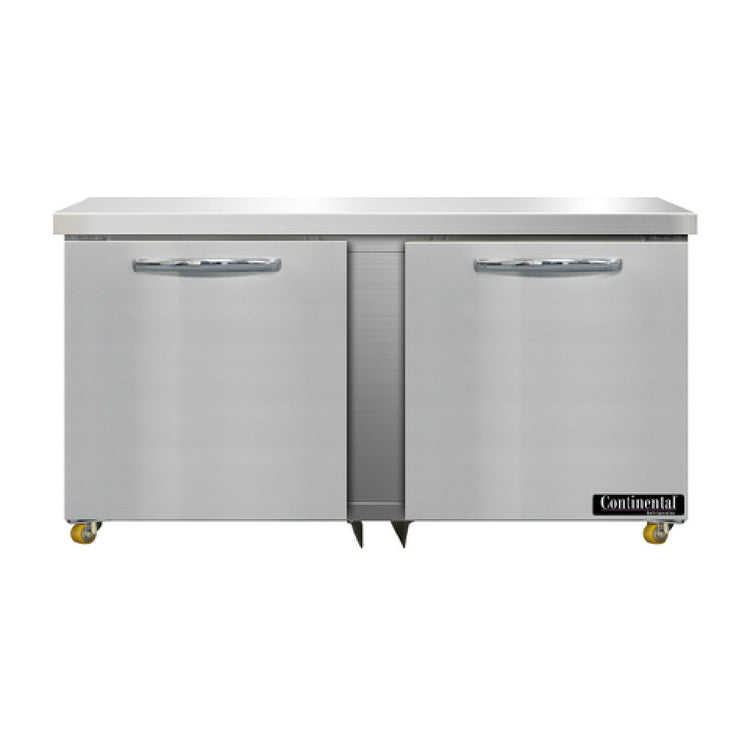 The Continental Refrigerator DF60N-U Designer Line Undercounter Freezer is a 60"W, two-section unit engineered for efficient and reliable cold storage in various commercial settings. This model features two field-rehingeable doors, enhancing versatility and accessibility in tight spaces. The stainless steel exterior and interior, along with a stainless steel top, ensure durability and ease of cleaning. Equipped with 1-3/8" diameter plate casters, the freezer is easily maneuverable, allowing it to adapt to dynamic kitchen environments. Its front-breathing design optimizes space utilization by permitting installation without side clearance. The electronic control with a digital display offers precise temperature management and includes a hi-low alarm for optimal food safety. The rear-mounted, self-contained refrigeration system uses R290 hydrocarbon refrigerant, a more environmentally friendly option that complies with modern sustainability standards. With a robust 1/2 HP compressor, the DF60N-U delivers powerful cooling performance essential for high-demand operations. This model meets cETLus and NSF standards, underscoring its compliance with stringent safety and sanitation regulations. The Continental Refrigerator DF60N-U is an ideal solution for businesses in the hospitality industry, including restaurants, cafes, and catering services, where space efficiency and reliable refrigeration are critical.