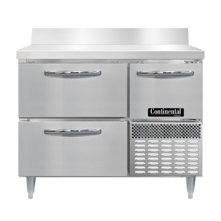 The Continental Refrigerator DFA43NSSBS-D Designer Line Freezer Base Worktop Unit 43"W is a versatile refrigeration solution designed for professional kitchens and food service environments. This unit features a reinforced stainless steel worktop with a 5-1/2" high backsplash, ensuring durability and ease of cleaning. The stainless steel exterior, front, sides, and interior further enhance its robust construction. It includes two drawers and one half-height field rehingeable door, providing flexible storage options. The unit stands on 6" adjustable stainless steel legs, allowing for stability and height customization. Equipped with an electronic control system, it features a digital display and a high-low alarm for precise temperature management. Utilizing R290 hydrocarbon refrigerant and powered by a 1/4 HP side-mounted refrigeration system, this freezer base is both efficient and environmentally friendly. It is certified by cETLus and NSF, ensuring compliance with industry standards for safety and performance. This combination of features makes the Continental Refrigerator DFA43NSSBS-D an ideal choice for chefs and kitchen professionals seeking reliability and efficiency in their refrigeration solutions.