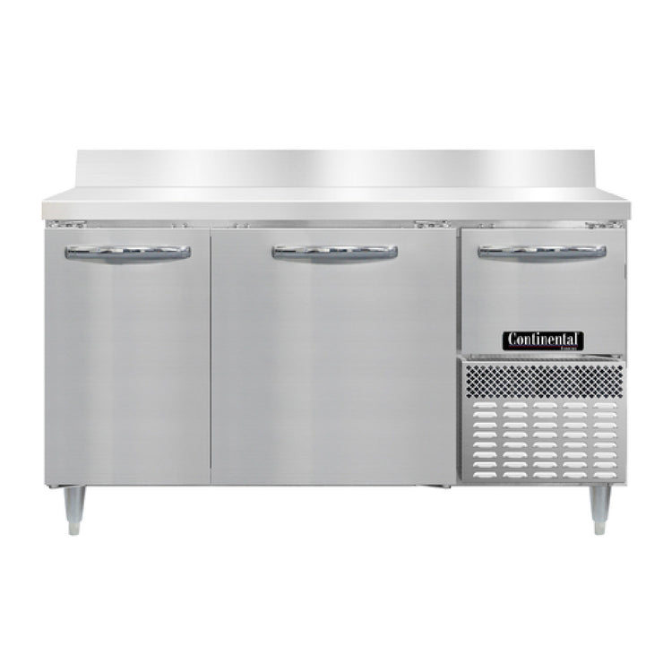 The Continental Refrigerator DFA60NSSBS Designer Line Freezer Base Worktop Unit 60"W is an expertly designed unit catering to various segments within the food service industry. This unit features a reinforced stainless steel worktop accompanied by a 5-1/2"H backsplash, ensuring durability and ease of cleaning. Its elegant stainless steel construction extends across the exterior, front, sides, and interior, providing a sleek appearance and robust protection against daily wear and tear. The freezer base is equipped with two full and one half-height field rehingeable doors, offering versatile access to stored items. Supported by 6" adjustable stainless steel legs, this unit can be customized for optimal height in diverse kitchen environments. The integrated electronic control with a digital display ensures precise temperature management, accompanied by a hi-low alarm for added security. Utilizing R290 hydrocarbon refrigerant and powered by a 1/2 HP side-mounted refrigeration system, the DFA60NSSBS is designed for energy-efficient operation. The unit is cETLus and NSF certified, highlighting its compliance with safety and sanitation standards. This worktop unit seamlessly combines functionality and style, making it a valuable asset for establishments seeking reliable refrigeration solutions with a refined aesthetic.