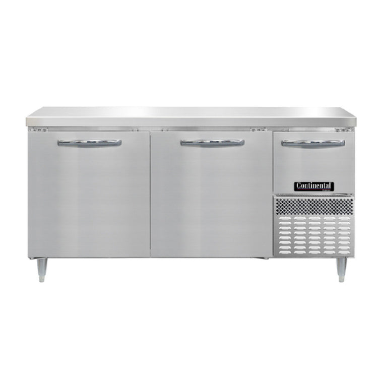 The Continental Refrigerator DFA68NSS Designer Line Freezer Base Worktop Unit is a versatile 68"W appliance, perfect for commercial kitchens requiring efficient refrigeration solutions. This unit is crafted with a reinforced stainless steel work top, delivering durability and an aesthetically pleasing finish. Its stainless steel exterior encompasses the front, sides, and interior, ensuring robustness and ease of cleaning. Equipped with two full and one half height field rehingeable doors, it offers flexible access and storage options. The freezer base stands on 6" adjustable stainless steel legs, providing stability while allowing for height customization to fit various kitchen configurations. The advanced electronic control system with a digital display ensures precise temperature regulation, complemented by a hi-low alarm for added safety. Utilizing R290 hydrocarbon refrigerant, the unit is environmentally friendly and efficient. A 1/2 HP side-mounted refrigeration system guarantees optimal performance, maintaining consistent temperatures. The DFA68NSS meets cETLus and NSF standards, underscoring its reliability and compliance with safety regulations. This unit is ideal for different segments of the food service industry, from restaurants to catering companies, offering a combination of cutting-edge technology and practical design to enhance kitchen operations.
