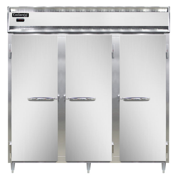 The Continental Refrigerator DL3W-PT Designer Line Heated Cabinet Pass-thru Three-section is a robust and efficient solution for commercial refrigeration needs. With a substantial capacity of 72 cubic feet, this three-section unit supports diverse storage requirements. It features three shelves per section, facilitating organized storage within its aluminum exterior and interior framework. The unit's stainless steel front and doors provide durability and a sleek appearance, enhancing its suitability for high-traffic environments. Designed with narrow full-height doors, it maximizes space efficiency, while the standard depth cabinet ensures a compact fit within various kitchen layouts. The electronic control system includes a digital display, allowing precise temperature management and monitoring. Its integrated hi-low alarm protects contents by alerting users to temperature fluctuations. Certified by cETLus and NSF, the DL3W-PT meets rigorous safety and sanitation standards, making it a reliable choice for food service operations. This pass-thru heated cabinet is engineered for optimal performance across different market segments, offering unique value through its combination of capacity, design, and certified safety features.