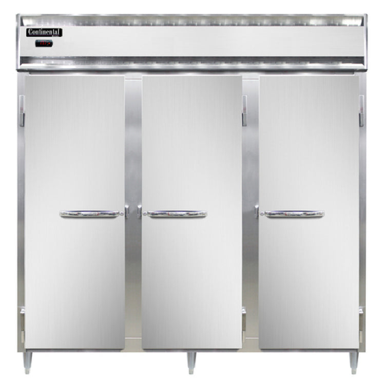 The Continental Refrigerator DL3W-SA-PT Designer Line Heated Cabinet Pass-thru Three-section is a versatile and robust solution for storage needs in commercial kitchens and foodservice environments. With a substantial capacity of 72 cubic feet, this heated cabinet is structured into three sections, offering three adjustable shelves per section for organized and efficient storage. The exterior is crafted from durable stainless steel, while the interior features a resilient aluminum finish, ensuring longevity and reliability. Designed with narrow full-height doors, this pass-thru model facilitates easy access from both sides, making it ideal for high-traffic areas. The cabinet incorporates advanced electronic control with a digital display, providing precise temperature management along with a hi-low alarm for enhanced operational safety. The standard depth of the cabinet ensures compatibility with various kitchen layouts. Certified by cETLus and NSF, it adheres to stringent safety and sanitation standards, making it a dependable choice for businesses that prioritize health compliance and performance. This heated cabinet is particularly beneficial for operations that require consistent warming and storage of food items, such as restaurants, hotels, and catering services, enhancing both the quality of service and efficiency in professional culinary environments.