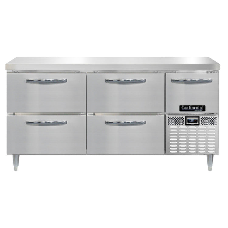 The Continental Refrigerator DRA68NSS-F Designer Line Work Top Fish File is a versatile and robust refrigeration solution tailored for the commercial kitchen environment. Measuring 68 inches in width, it combines functionality with a sleek aesthetic, featuring a 300 stainless steel work top that ensures durability and easy maintenance. The unit is equipped with four drawers and one half-height door, providing ample storage space for seafood and other perishables. Its stainless steel exterior not only offers a professional look but also enhances durability against daily wear and tear. The electronic control system ensures precision in temperature management, while the off-cycle defrost feature promotes energy efficiency. With side-mounted refrigeration and the use of environmentally-friendly R290 hydrocarbon refrigerant, this fish file supports sustainable operation. Designed with 6-inch adjustable stainless steel legs, it allows for easy leveling and stability on any surface. The unit operates with a 1/4 HP compressor, and its compliance with cETLus and NSF standards guarantees safety and quality. This refrigeration unit is ideal for restaurants, hotels, and catering services that require reliable performance and a high standard of food storage. Its thoughtful design and advanced features make it a crucial component for any professional kitchen setup.