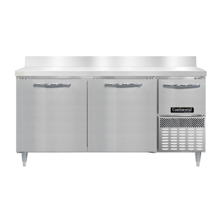 The Continental Refrigerator DRA68NSSBS Designer Line Refrigerated Base Worktop Unit is an advanced, energy-efficient cooling solution ideal for commercial kitchens. With its 68-inch width and reinforced stainless steel work top featuring a 6-inch backsplash, it integrates durability with functionality. The unit's exterior, front, sides, and interior are constructed from stainless steel, ensuring a sleek look and robust performance. This refrigerated base offers versatile storage with two full-height and one half-height field rehingeable doors, catering to various culinary needs. Supported by 6-inch adjustable stainless steel legs, the unit promises stability and adaptability. Its electronic control system and off-cycle defrost function enhance operational efficiency and ease of use. Powered by a 1/4 HP side-mounted refrigeration system, this unit utilizes R290 hydrocarbon refrigerant, aligning with modern environmental standards. Certified by cETLus and NSF, and recognized with an ENERGY STAR rating, the DRA68NSSBS not only meets but exceeds industry standards for safety and energy conservation. This model is an optimal choice across food service segments, offering a perfect balance of technological sophistication and practical application, making it indispensable for efficient kitchen workflows.