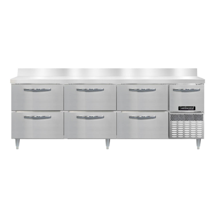 The Continental Refrigerator DRA93NSSBS-D Designer Line Refrigerated Base Worktop Unit is a robust and versatile addition to any professional kitchen, offering a generous width of 93 inches. Its design includes a reinforced stainless steel work top and a 6-inch high backsplash, providing durability and ease of maintenance. The unit features a stainless steel exterior encompassing the front, sides, and interior, ensuring long-lasting performance and a sleek appearance. With six drawers and a half-height field rehingeable door, this unit is designed for flexible storage solutions. The adjustable 6-inch stainless steel legs accommodate various kitchen settings, and the electronic control system enables precise temperature management. The off-cycle defrost feature enhances efficiency, while the side-mounted refrigeration system, powered by a 1/4 HP motor, ensures effective cooling. Utilizing R290 hydrocarbon refrigerant, this unit is environmentally friendly and energy-efficient. Compliant with cETLus and NSF standards, the Continental Refrigerator DRA93NSSBS-D is suitable for diverse market segments in the food service industry, providing reliable and high-quality refrigeration capabilities.