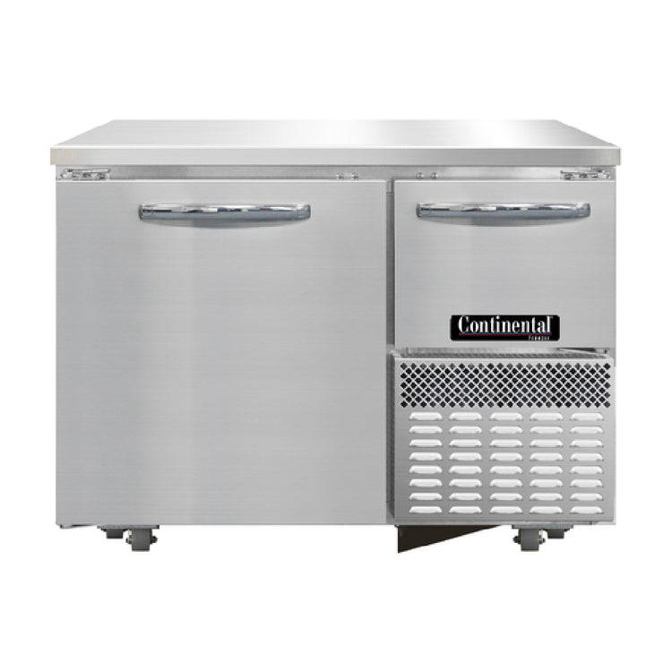 The Continental Refrigerator FA43N-U Undercounter Freezer Base is a compact yet powerful refrigeration solution, measuring 43 inches wide, designed to meet the needs of commercial kitchens and food service environments. Its robust construction features stainless steel front and end panels, complemented by a durable stainless steel top and an aluminum interior. This unit is equipped with one full and one half-height door, both of which are field rehingeable, allowing flexibility in door orientation to suit various kitchen layouts. The FA43N-U employs an electronic control system and off-cycle defrost, ensuring efficient temperature maintenance. It utilizes R290 hydrocarbon refrigerant and features a front-breathing design with side-mounted refrigeration, optimizing performance and energy efficiency. With a 1/3 HP compressor, this undercounter freezer delivers reliable cooling power. Mobility is enhanced by eight 1-3/8-inch diameter plate casters mounted on heavy-duty support plates, which are easily field installed. Certified by cETLus and NSF, this freezer base assures compliance with safety and sanitation standards. The Continental Refrigerator FA43N-U offers a versatile and efficient solution for professional kitchens seeking to maximize space without compromising on performance.