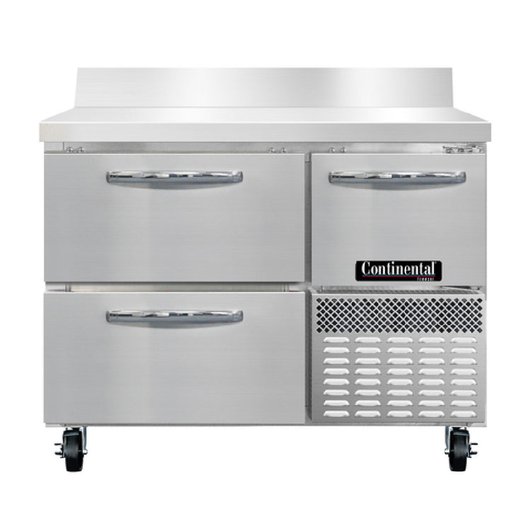 The Continental Refrigerator FA43NBS-D Freezer Base Worktop Unit - 43"W, is a high-performance equipment designed for commercial kitchens demanding efficient space utilization and reliable refrigeration. Featuring a 300 series stainless steel work top with a 6"H backsplash, this unit combines durability with functionality, ideal for rigorous kitchen environments. The exterior boasts stainless steel front and end panels, complemented by a galvanized steel rear and grill, while the interior is lined with aluminum, ensuring longevity and ease of maintenance. This unit accommodates (2) drawers, each capable of holding (2) 12 x 20 x 6 pans, although pans are supplied by others, enhancing its utility in food preparation and storage. It includes a half-height field rehingeable door, maximizing accessibility and adaptability to kitchen layouts. Engineered with electronic control and off-cycle defrost, this unit maintains optimal temperature efficiency. Powered by a 1/3 HP compressor and utilizing R290 hydrocarbon refrigerant, it ensures environmentally conscious cooling. The side-mounted refrigeration system further optimizes kitchen space. Certified by cETLus and NSF, this freezer base worktop unit upholds the highest health and safety standards, making it a versatile choice for diverse market segments within the food service industry, including restaurants, catering services, and institutional kitchens.