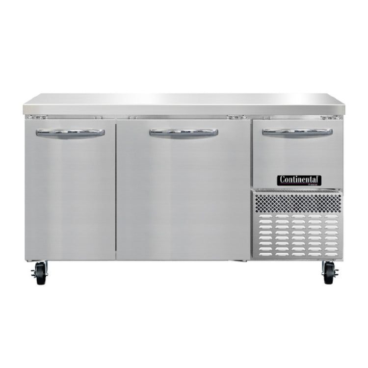 The Continental Refrigerator FA60N Freezer Base Worktop Unit is a sophisticated and versatile piece of equipment designed for commercial kitchens demanding both functionality and durability. With a width of 60 inches, this unit is crafted from 300 series stainless steel, featuring a flat work top that provides a robust and hygienic workspace. Its stainless steel front and end panels, combined with a galvanized steel rear and grill, ensure longevity and resilience in high-use environments. The aluminum interior houses two full and one half-height field rehingeable doors, offering flexibility in storage configuration. An electronic control system manages the unit efficiently, complemented by an off-cycle defrost mechanism to maintain optimal performance. Powered by a 1/2 HP motor and utilizing R290 hydrocarbon refrigerant, this side-mounted refrigeration system is both powerful and environmentally conscious. Certified by cETLus and NSF, the FA60N meets stringent safety and quality standards. This unit stands out in the market for its combination of advanced refrigeration technology and durable construction, making it an excellent choice for restaurants, catering services, and any food service establishment requiring reliable cold storage with an integrated work surface.