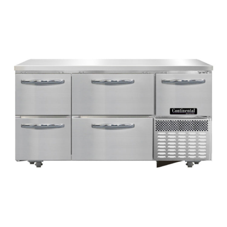 The Continental Refrigerator FA60SN-U-D Undercounter Shallow Depth Freezer Base is a compact and versatile refrigeration unit measuring 60 inches in width, designed for efficient use in commercial environments. Its exterior features stainless steel front and end panels, complemented by a durable stainless steel top. The interior is crafted from aluminum, providing a reliable and hygienic storage space. The unit accommodates various storage needs with its (2) drawers, each designed to hold (1) 12 x 20 x 6 pans, and (2) narrow drawers that can house (4) 6 x 6 2/3 x 6 pans per drawer; all pans are supplied by others. Additionally, it includes a half-height field rehingeable door for flexible access. It operates on a 1/2 HP motor using R290 hydrocarbon refrigerant, known for its efficient cooling and environmental benefits. The freezer utilizes an electronic control system with an off-cycle defrost feature for energy efficiency. Its front-breathing, side-mounted refrigeration system ensures optimal space utilization and performance. The unit is mobile, thanks to (8) 1-3/8 inch diameter plate casters mounted on heavy-duty support plates, making it easy to install and relocate. It is certified by cETLus and NSF, affirming its compliance with safety and sanitation standards, ideal for diverse professional kitchen applications.