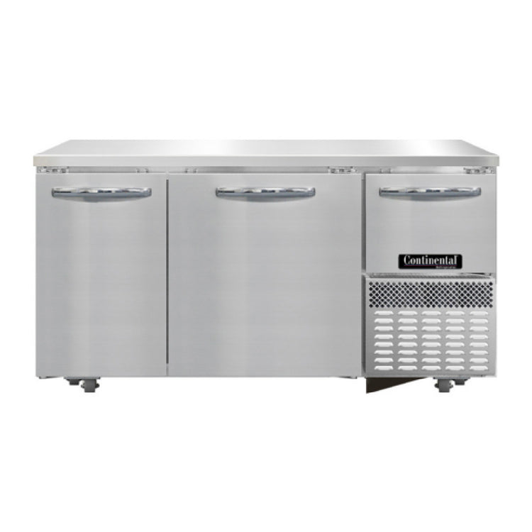 The Continental Refrigerator FA60SN-U Undercounter Shallow Depth Freezer Base 60"W is a cutting-edge appliance designed for modern kitchens that require efficient space utilization and advanced refrigeration technology. Featuring a stainless steel front and end panels alongside a stainless steel top, this freezer base ensures durability and longevity. Its aluminum interior houses two full-height and one half-height field rehingeable doors, providing flexible storage options. The unit operates with an electronic control system and employs off-cycle defrost, optimizing its energy efficiency. Equipped with eight 1-3/8" diameter plate casters mounted on heavy-duty support plates, the freezer is easily maneuverable and field-installable. The freezer boasts a 1/2 HP motor and utilizes R290 hydrocarbon refrigerant, making it an environmentally friendly choice. Its front-breathing and side-mounted refrigeration system further enhance its space efficiency. Compliant with cETLus and NSF standards, this undercounter freezer base is ideal for different segments of the food service industry, including restaurants, cafes, and catering businesses, providing both performance and reliability in a compact design.