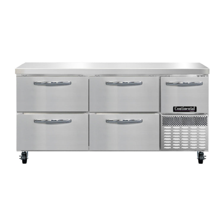The Continental Refrigerator FA68N-D Freezer Base Worktop Unit stands out in the commercial kitchen landscape with its impressive technical specifications and robust design. Measuring 68 inches in width, this unit features a flat work top constructed from high-quality 300 series stainless steel, ensuring durability and resistance to wear. The front and end panels are also crafted from stainless steel, while the rear and grill are made from galvanized steel, offering excellent structural integrity. Inside, the unit boasts an aluminum interior, optimizing thermal efficiency. Notably, it includes four drawers, each capable of accommodating two 12 x 20 x 6 pans, although these pans must be supplied separately. Additionally, the freezer base incorporates a half-height field rehingeable door, enhancing accessibility and flexibility. The FA68N-D employs electronic control and an off-cycle defrost system, driven by a 1/2 HP compressor using R290 hydrocarbon refrigerant, which is environmentally friendly. The side-mounted refrigeration system ensures efficient cooling, while the unit's compliance with cETLus and NSF certifications underscores its adherence to safety and sanitation standards. This freezer base worktop unit is a versatile component for various segments of the food service industry, offering reliable cold storage and workspace solutions for kitchens seeking superior performance and design.