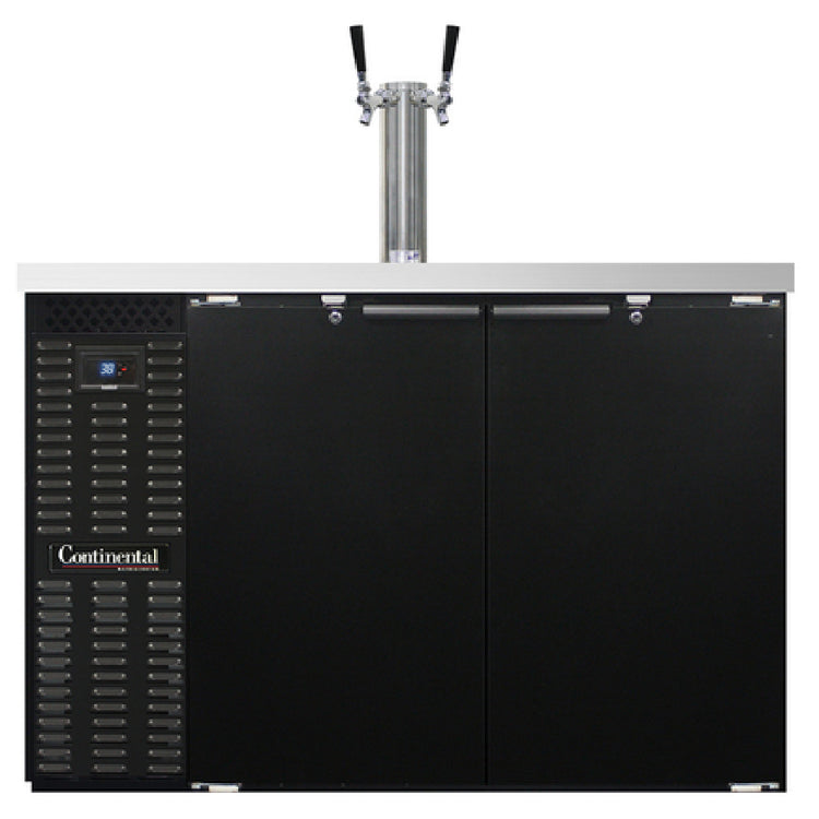 The Continental Refrigerator KC50SN Keg Cooler is a 50-inch wide unit designed to accommodate two straight wall kegs within its 13.0 cubic feet capacity, making it a compact and efficient choice for bars, restaurants, and hospitality businesses. This front-breathing keg cooler features a stainless steel top and a 23-inch shallow depth, allowing it to fit seamlessly into various layouts. Equipped with a column featuring two faucets and a drainer, it ensures easy dispensing and maintenance. The cooler is built with two doors that include locks for security. Its electronic controller with digital display and hi-low alarm offers precise temperature management, while the self-contained refrigeration system utilizes R290 hydrocarbon refrigerant, contributing to its eco-friendly operation. The cooler's exterior boasts a black enamel finish, while the interior is constructed with stainless steel back and side panels, reinforced by a stainless steel floor for enhanced durability. With a 1/4 horsepower motor, the Continental Refrigerator KC50SN Keg Cooler is both cETLus and NSF certified, ensuring compliance with safety and sanitation standards. This makes it a valuable asset for establishments needing reliable and efficient keg storage and dispensing solutions.