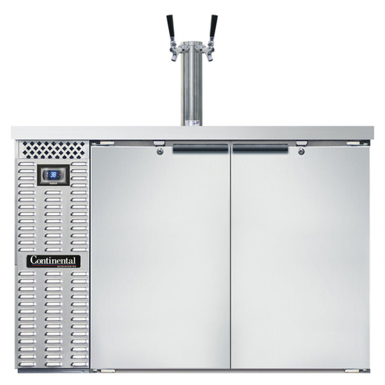 The Continental Refrigerator KC50SNSS Keg Cooler is a versatile, front-breathing appliance designed for efficient beverage storage, featuring a 50-inch width and a 13.0 cubic foot capacity. Engineered to accommodate two straight wall kegs, this keg cooler is ideal for bars, restaurants, and catering services seeking reliable refrigeration solutions. The stainless steel top adds durability and a sleek finish, while the inclusion of one column with two faucets and a drainer enhances its functionality for quick and convenient service. With a shallow depth of 23 inches, it is designed to fit into a variety of spaces without sacrificing capacity. The cooler is equipped with two doors, each fitted with locks for added security, and an electronic controller with a digital display provides easy monitoring and control. High-low alarms ensure efficient temperature management. A reinforced stainless steel floor and stainless steel interior back and side panels contribute to its robust construction. This self-contained unit uses R290 hydrocarbon refrigerant and operates with a 1/4 HP compressor, ensuring efficient and environmentally friendly cooling. Certified by cETLus and NSF, the Continental Refrigerator KC50SNSS Keg Cooler combines quality with compliance, making it a valuable asset for any commercial beverage service operation.