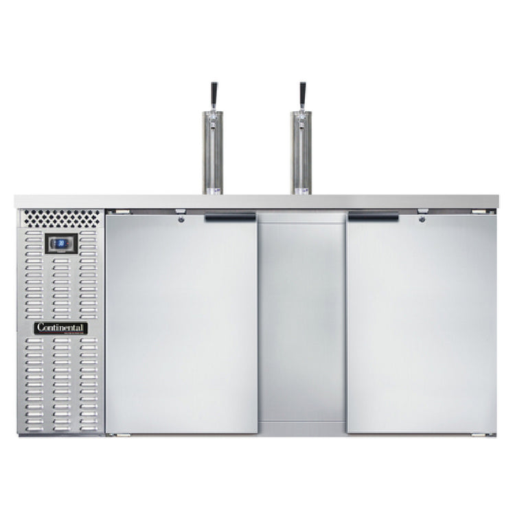 The Continental Refrigerator KC69SNSS Keg Cooler is a sophisticated refrigeration unit designed to enhance beverage service operations with its 69-inch width and 18.0 cubic feet capacity. Engineered for front breathing efficiency, it accommodates up to three barrel or straight wall kegs, making it a versatile choice for bars and restaurants. The unit features a stainless steel top complete with two columns and a drainer for organized dispensing. With a shallow depth of 23 inches, it seamlessly integrates into various spaces. Security is prioritized with two lockable doors. An electronic controller with a digital display and high-low alarm ensures precise temperature management. The keg cooler boasts a stainless steel exterior and interior back and side panels, along with a reinforced stainless steel floor for durability. Its self-contained refrigeration system utilizes R290 hydrocarbon refrigerant, contributing to eco-friendly operations. Powered by a 1/4 horsepower compressor, the unit meets cETLus and NSF certifications, confirming its adherence to industry standards. The Continental Refrigerator KC69SNSS is a reliable and efficient solution for any establishment seeking to maintain a consistent and high-quality beverage service, combining functionality with robust construction.