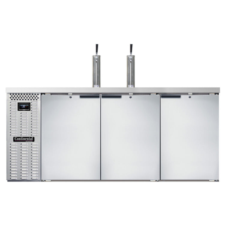 The Continental Refrigerator KC79NSS Keg Cooler is a high-capacity refrigeration unit expertly designed for the efficient storage of beverages, accommodating up to 3 barrels or 4 straight wall kegs within its expansive 79-inch width and 28.0 cu. ft. of storage space. This keg cooler features a front-breathing system, ensuring optimal air circulation and temperature consistency, vital for maintaining the quality of stored beverages. The unit's top is crafted from stainless steel and includes two columns and a drainer, adding functional elegance to its robust design. It boasts three doors equipped with locks, enhancing security and access control. The electronic controller with a digital display and hi-low alarm provides user-friendly operation while ensuring precise temperature management. Constructed with a stainless steel exterior and reinforced stainless steel interior back and side panels, this keg cooler guarantees durability and longevity in demanding environments. The self-contained refrigeration system utilizes R290 Hydrocarbon refrigerant, highlighting its commitment to energy efficiency and environmental responsibility. With a 1/4 HP motor, the Continental Refrigerator KC79NSS is certified by cETLus and NSF, underscoring its compliance with industry standards. This makes it an ideal choice for bars, restaurants, and event venues seeking reliable and efficient beverage storage solutions.