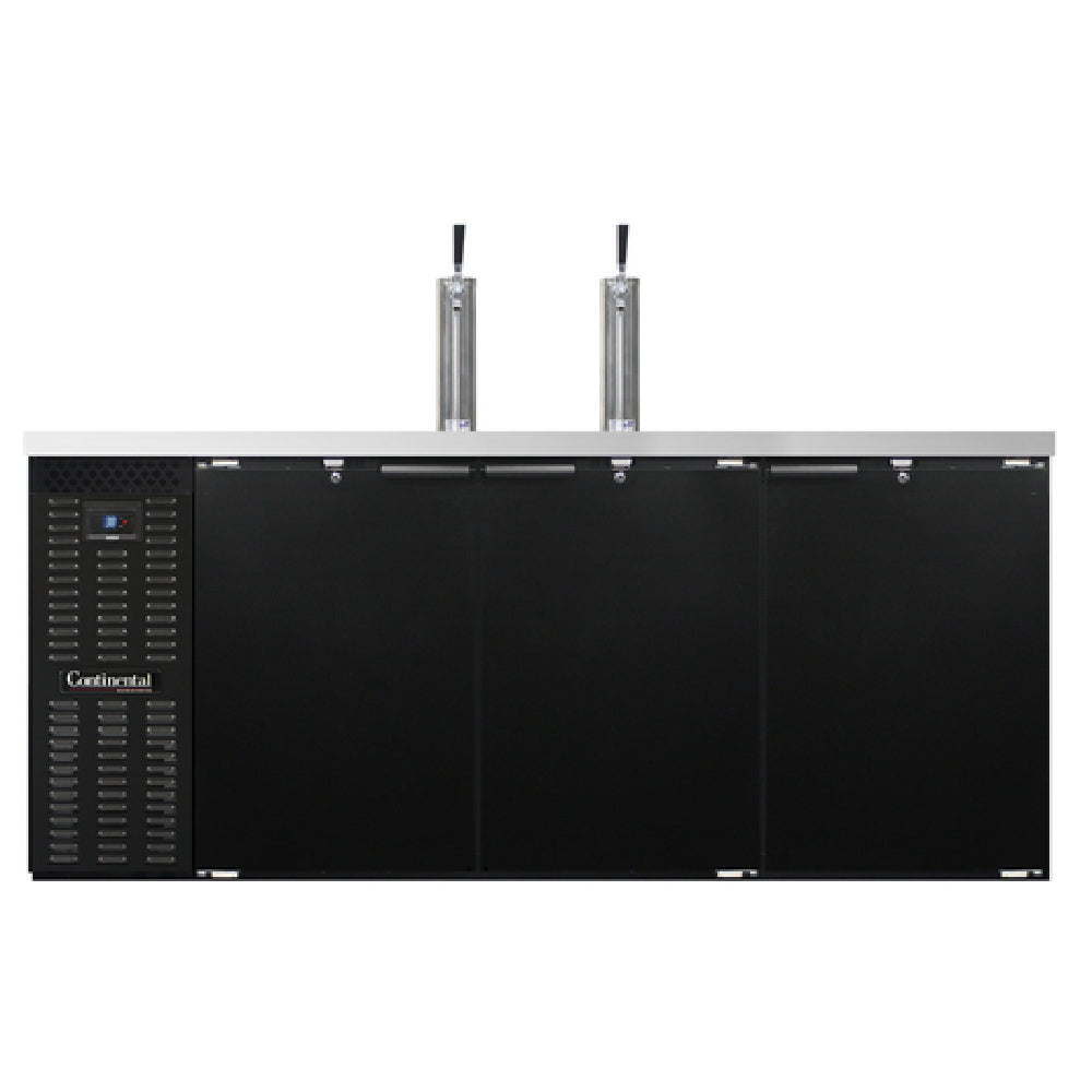 The Continental Refrigerator KC79SN Keg Cooler is a highly efficient storage solution designed for beverage service professionals, featuring a substantial capacity of 28.0 cubic feet. This 79-inch wide unit accommodates up to three barrel or straight wall kegs, making it ideal for high-volume service environments. The cooler is designed with a 23-inch shallow depth for space efficiency without compromising storage capabilities. Technologically advanced, it features a self-contained refrigeration system utilizing R290 Hydrocarbon refrigerant and a 1/4 HP compressor, ensuring reliable cooling with environmental responsibility. The stainless steel top is equipped with two columns and a drainer, adding functionality and ease of use. Aesthetically, it boasts a sleek black enamel finish exterior, while the interior is fortified with stainless steel back and side panels and a reinforced stainless steel floor, ensuring durability and ease of maintenance. The three doors are equipped with locks for security, and an electronic controller with a digital display and hi-low alarm provides precise temperature management. Certified by cETLus and NSF, the KC79SN meets rigorous industry standards, making it a versatile and valuable asset for bars, restaurants, and catering services seeking efficiency and reliability in their beverage cooling operations.