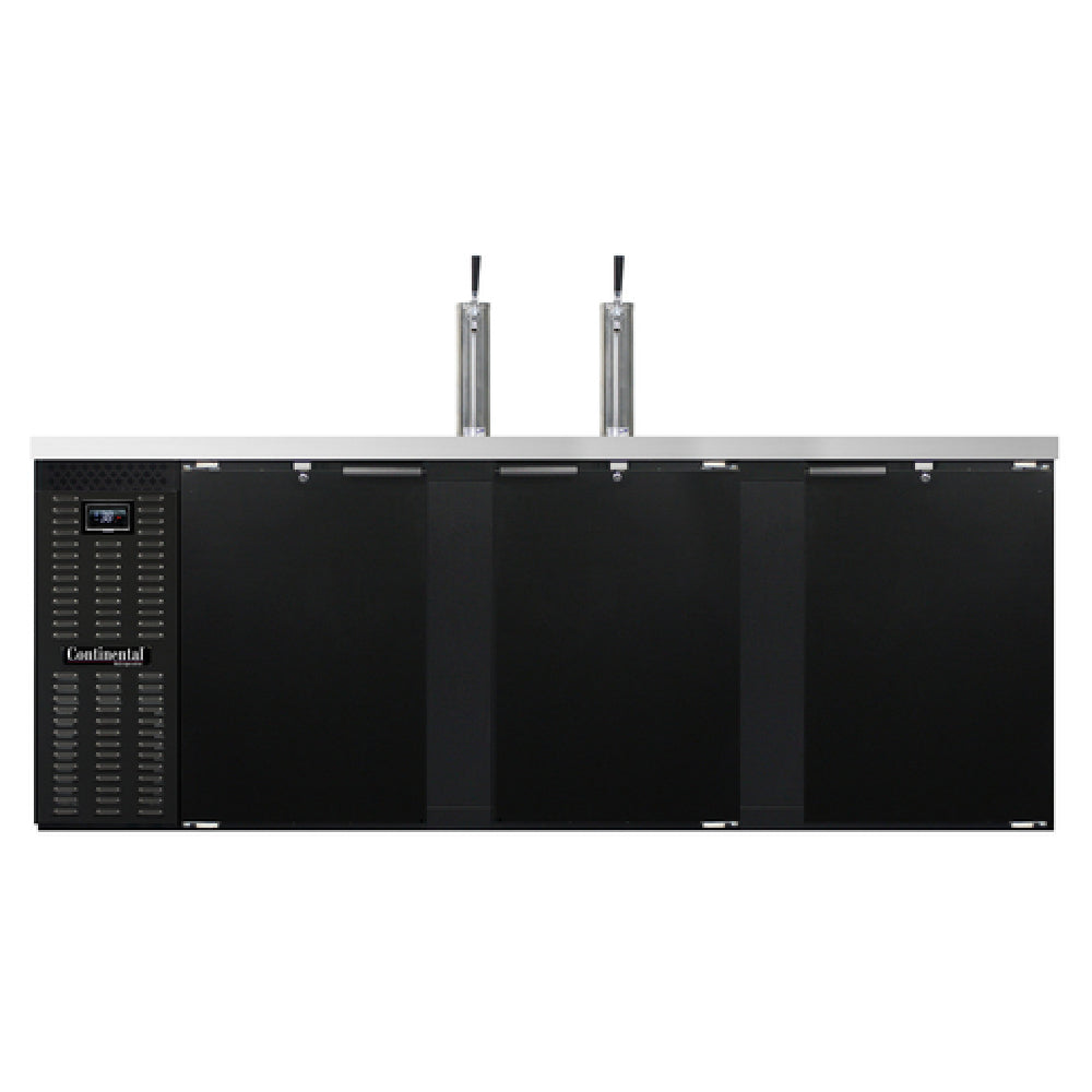 The Continental Refrigerator KC90N Keg Cooler is a robust and versatile refrigeration unit designed to accommodate either four barrel kegs or five straight wall kegs within its spacious 35.0 cu. ft. interior. Ideal for bars, restaurants, and large-scale events, this keg cooler features a sleek 90"W design with a front-breathing mechanism for enhanced airflow. The stainless steel top is equipped with two columns and a drainer, offering both durability and convenience in beverage dispensing. It includes three lockable doors, ensuring secure storage of your valuable inventory. The electronic controller with a digital display and hi-low alarm provides precise temperature management, crucial for maintaining the quality of your beverages. The exterior boasts a sophisticated black enamel finish, while the interior is constructed with stainless steel back and side panels and a reinforced stainless steel floor, ensuring longevity and easy maintenance. With a self-contained refrigeration system utilizing R290 Hydrocarbon refrigerant and powered by a 1/4 HP compressor, the KC90N guarantees efficient cooling performance. Certified by cETLus and NSF, it meets rigorous safety and sanitation standards, making it a reliable choice for any professional setting in the food and beverage industry.