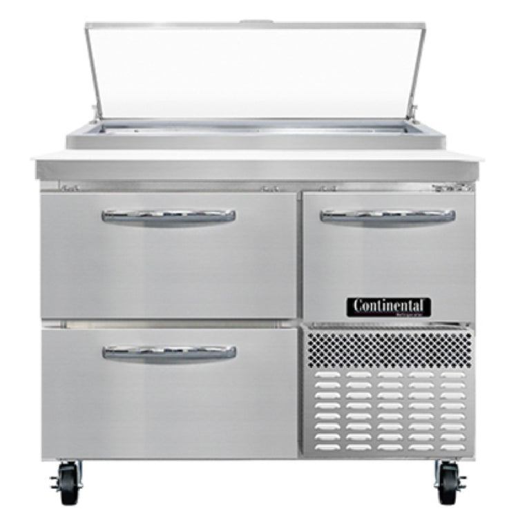 The Continental Refrigerator PA43N-D Pizza Prep Table 43"W One-section features a 12.0 cubic feet capacity and is engineered for efficiency and convenience in professional kitchens. Crafted with a 300 series stainless steel work top, it includes a 19" poly cutting board, making it a versatile asset for pizza preparation and other culinary tasks. This unit is equipped with two drawers, each accommodating two 12 x 20 x 6 pans, which are supplied by others, providing ample storage for ingredients. Additionally, it includes a half-height field rehingeable door, enhancing accessibility and storage flexibility. The forced air system, side-mounted refrigeration, and reversing condenser fan ensure consistent temperature maintenance, while the R290 Hydrocarbon refrigerant and hot gas condensate evaporator enhance its environmental efficiency. The stainless steel front and end panels, coupled with an aluminum interior, contribute to durability and ease of maintenance. The electronic control and off cycle defrost add to the operational efficiency, and the unit is powered by a 1/4 HP motor. Certified by cETLus and NSF, this prep table is designed to meet high standards of safety and sanitation, making it an ideal choice for pizzerias, restaurants, and catering businesses looking for reliability and performance.