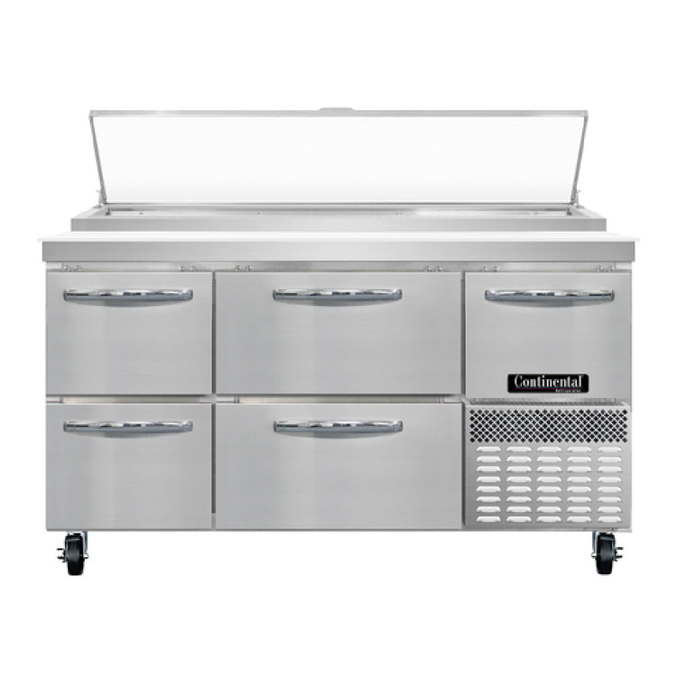 The Continental Refrigerator PA60N-D Pizza Prep Table is an advanced solution designed for professional kitchens, offering a two-section configuration with a 60-inch width to accommodate various culinary needs. Its 19.0 cubic feet capacity, supported by a forced air system, ensures efficient cooling and storage. The 300 series stainless steel worktop, paired with a 19-inch deep nylon cutting board, provides a durable and practical workspace for food preparation. With its flexible storage design, the unit features two drawers capable of holding two 12 x 20 x 6 pans each, and two narrow drawers each fitting one 12 x 20 x 6 pan, allowing for customized organization. Additionally, a half-height field rehingeable door provides further convenience. The unit incorporates a hot gas condensate evaporator and a side-mounted refrigeration system powered by a 1/3 HP compressor using R290 Hydrocarbon refrigerant, enhancing its energy efficiency. Electronic controls facilitate precise temperature management, while the off cycle defrost ensures hassle-free maintenance. The stainless steel front and end panels, complemented by an aluminum interior, offer durability and easy cleaning. With features like a reversing condenser fan and certifications like cETLus and NSF, this prep table is a sophisticated choice for diverse culinary environments, prioritizing performance and reliability.